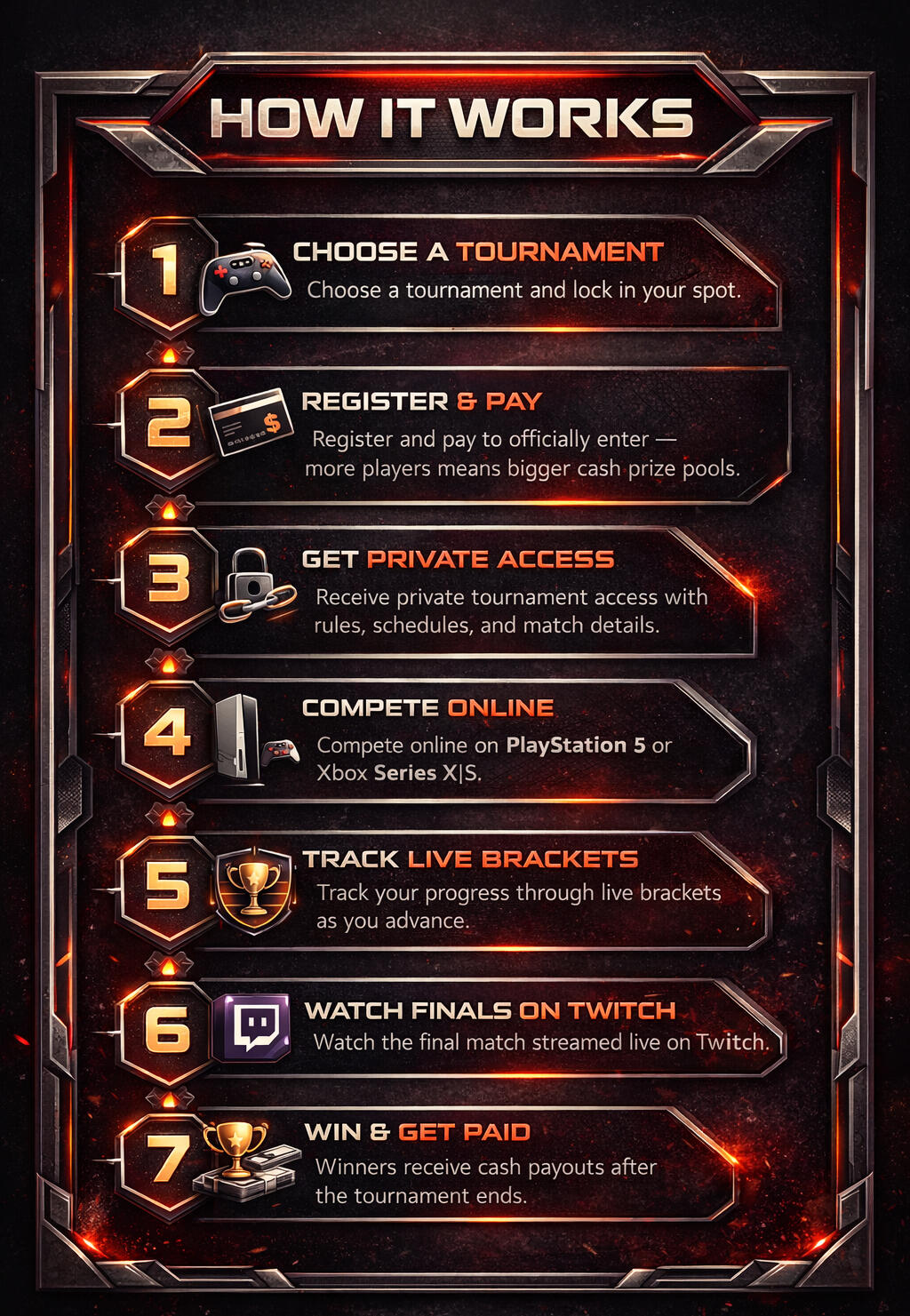 We are a Premiere competitive online tournament hub built for gamers who want high-stakes matchups, live action, and real cash payouts.We host live online tournaments across multiple games using Live brackets, Social Media and Twitch Streams .The more players that enter, the bigger the prize pool grows.We currently only support